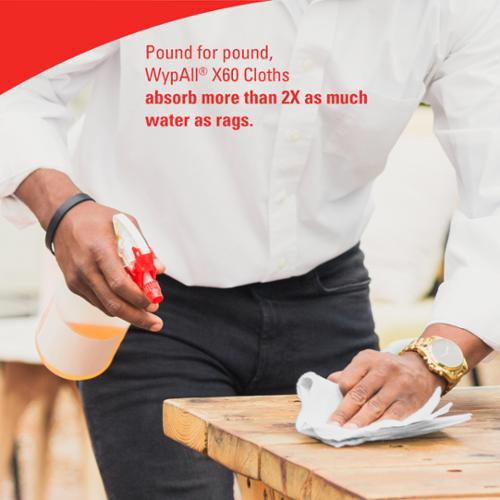 WypAll is the number one brand of disposable wipes in the US and Canada. Create a clean work environment with light to medium duty general cleaning solutions. You can trust WypAll General Clean X60 Multi-Task Cleaning Cloths-Washcloths for efficient cleaning. Pound for pound, WypAll General Clean X60 Multi-Task Cleaning Cloths absorb more than two times as much water as rags. They bring the absorbing power of HydroKnit technology (for superior absorbency) to a lighter-weight cloth. Designed to outperform laundered rags, WypAll X60 Cloths help raise the standard for general-purpose cloths at a terrific value. They dont use adhesives or binders, so theyll leave no residue behind, and theyre reinforced for strength when wet or dry. These cleaning washcloths are so sturdy that they can often be used more than once (once youve used them a few times, theyre disposable). Theyre designed to reduce waste so you spend less. When effectiveness and value top your list of criteria, you can trust WypAll General Clean X60 Multi-Task Cleaning Cloths to deliver. 12.5" x 10" sheet size.
