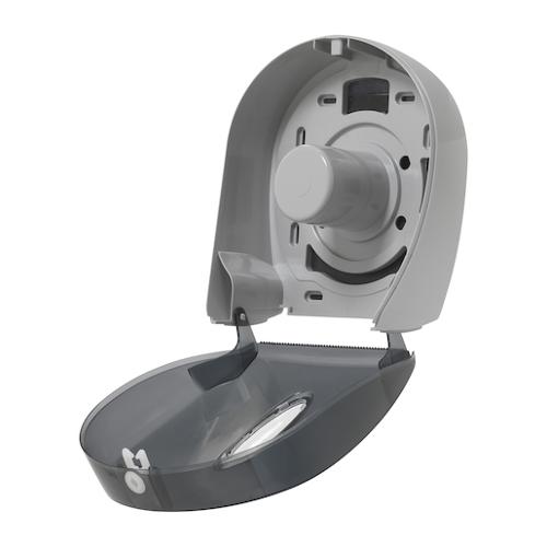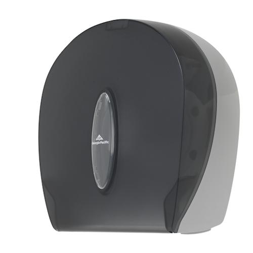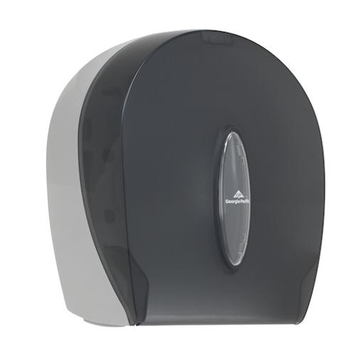 This durable, high-capacity 9" jumbo bath tissue dispenser holds one roll up to 9" in diameter-the equivalent length of 5.4 rolls of standard 2-ply tissue. Attractive see-through grey color complements any decor. This covered, key-lock design helps protect against waste as well as pilferage while making refilling rolls quick and easy.
