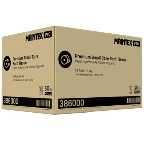 Maintex Pro 2-Ply Small Core Toilet Tissue is designed for high-traffic restrooms. This High quality bath tissue delivers the same softness and strength as national brands while reducing maintenance needs. The space saving small core design maximized roll length while fitting standard tissue dispensers with a simple spindle modification. Perfect for office buildings, healthcare facilities, and high-traffic public restrooms, Maintex Pro 2-Ply Small Core Toilet Tissue ensures long-lasting performance and fewer roll changeskeeping your facility stocked and your customers satisfied. Made with 40% recycled content and FSC certified, supporting responsible forestry. Sheet Size: 3.85" x 3.75". This item replaces 340591, 340595, 344091 & 344900.
