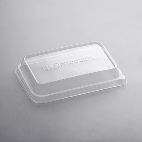 op off your environmentally-friendly take-out container with this Eco Products EP-SCRC24LID WorldView 100% recycled content rectangular plastic lid. This lid is made from 100% recycled post-consumer plastic. Using this lid helps reduce the carbon footprint of your business and alerts your customers to the fact that you are dedicated to sustainability. The recycled plastic material is not only created with ethically-sourced material, it's also incredibly durable and guaranteed not to leak.
