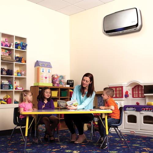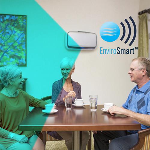 The only air purifier that automatically responds to occupancy and air quality levels. Delivers 3-5 air changes per hour (ACH) in 300-550 square feet shared spaces such as waiting rooms and restrooms. Quiet operation. Patented EnviroSmart technology continuously monitors occupancy and room air quality and automatically adjusts to clean the air. 4-stage True HEPA filtration system removes 99.97% of all airborne contaminants, including viruses. Antimicrobial HEPA treatment prevents bacteria growth on the filter and activated carbon filter reduces odors and VOCs. Commercial grade wall mount air purifier with 5-year limited warranty.