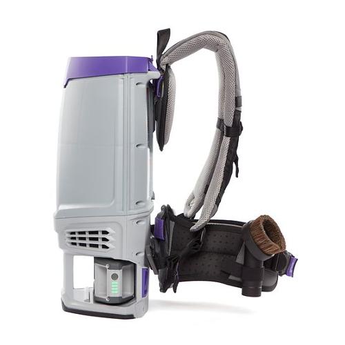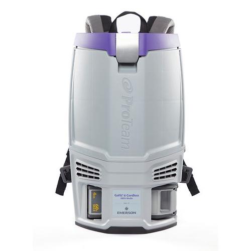Go wherever your tasks take you with ProTeams newest line of cordless commercial backpack vacuums, the GoFit Cordless Series, which includes a this 6 qt. version. Cordless vacuuming with the 6 qt. allows you to maneuver around obstacles safely and quietly without the restrictions of a cord, increasing your productivity by 30% compared to corded backpack vacuums. The GoFit 6 Cordless has a larger capacity than its smaller counterpart for those needing to tackle longer cleaning jobs. This backpack vacuum weighs only 13.5 lbs. even with the 4Ah battery installed, so its comfortable to wear for long periods of time. Use the high/low power switch to control the power setting and spend more time cleaning with an extended runtime of approximately 51 minutes on low and approximately 39 minutes on high. Since personalized comfort is crucial especially for longer cleaning jobs, the 6 qt. features a 4-step quick-adjust FlexFit harness designed to be easily adjusted with no tools required. It also has advanced multi-layered ProLevel Filtration with HEPA Media that reduces allergens in the air and a brushless motor that prevents carbon dust.