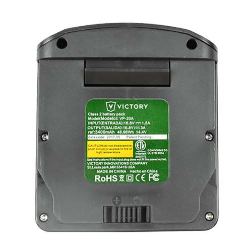 This high capacity brand Victory Lithium-Ion battery for use with Victory Electrostatic Sprayers delivers up to 2x the runtime than our Victory standard VP20 battery. Victory battery VP20B delivers 8 hours of runtime and can be recharged up to 800 times. 16.8 Voltages. 6800m Amperage.